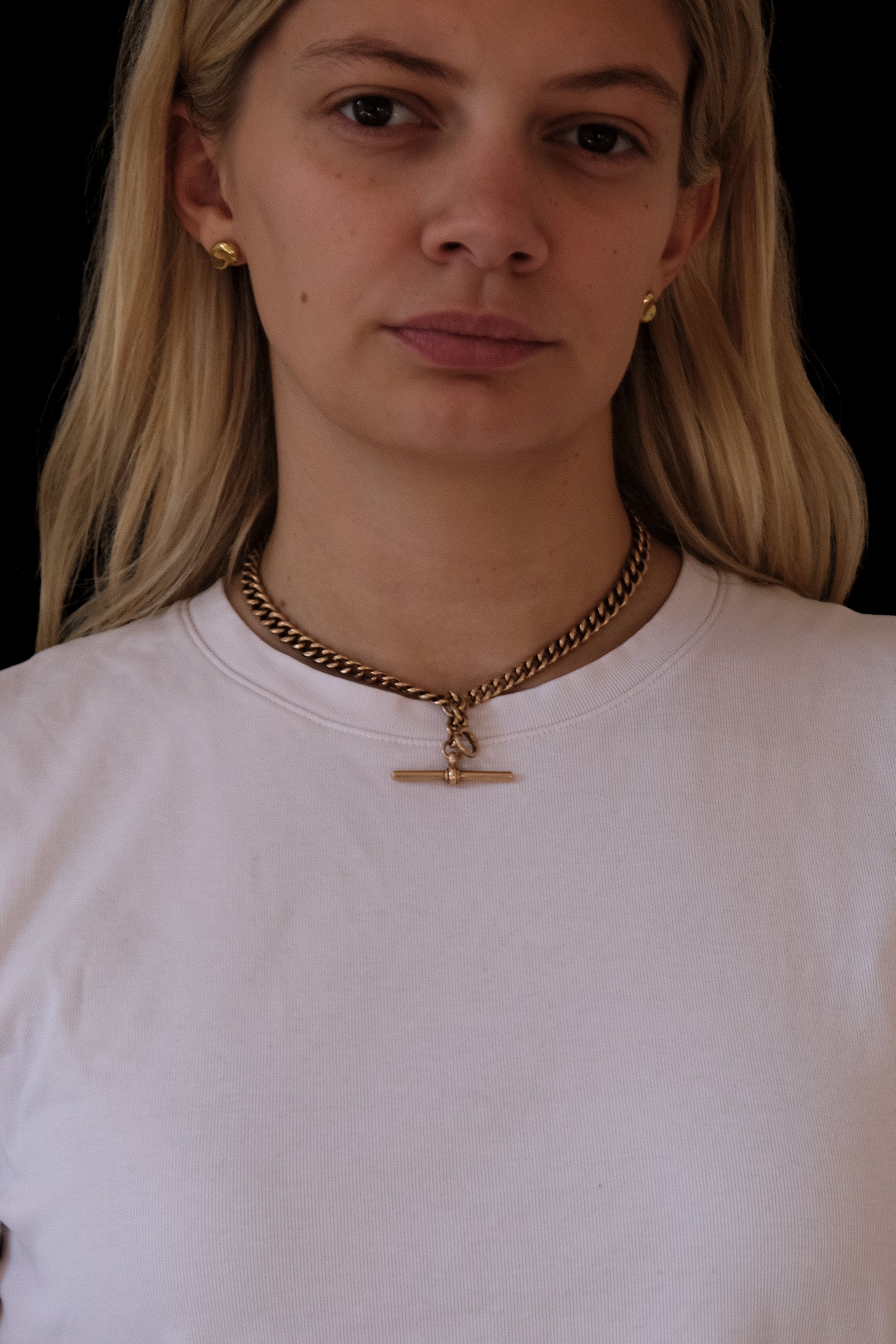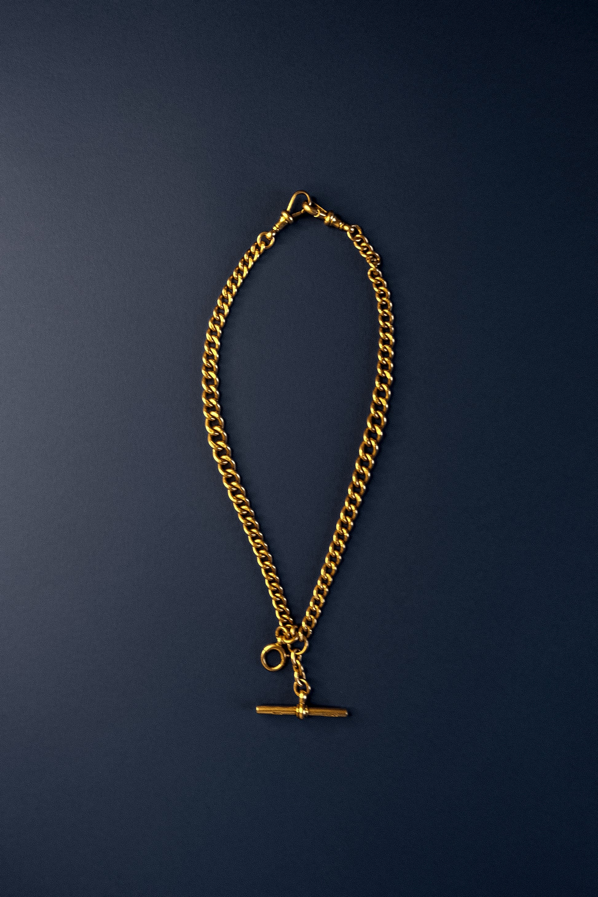 A superbly made 9ct rose gold Albert chain, converted to a necklace and retaining all the hallmarks of quality: fully hallmarked links, original dog clips, a bolt ring, and its matching T-bar. Each side is beautifully graduated, giving the chain that classic Victorian weight distribution and elegant drape around the neck.