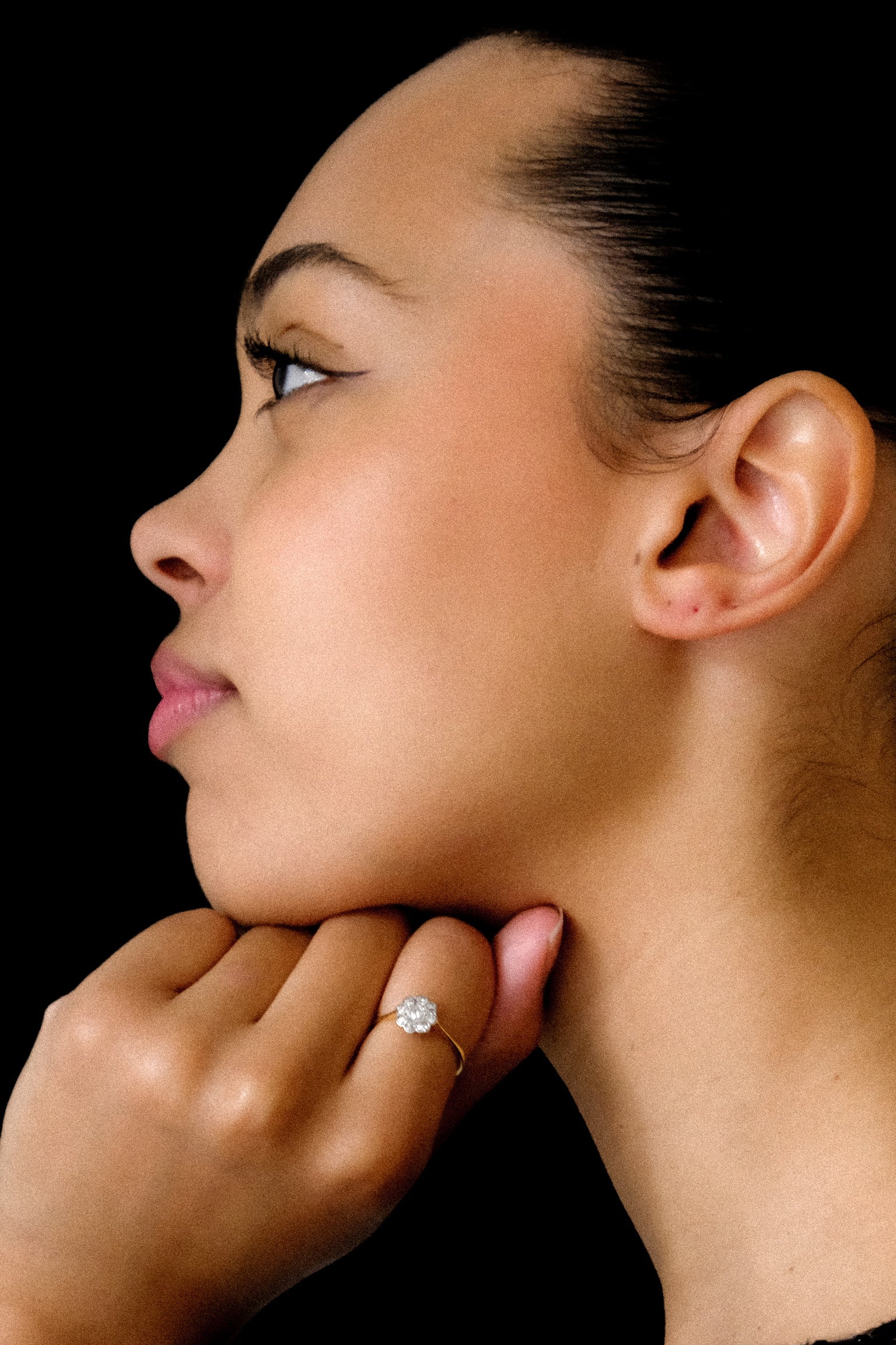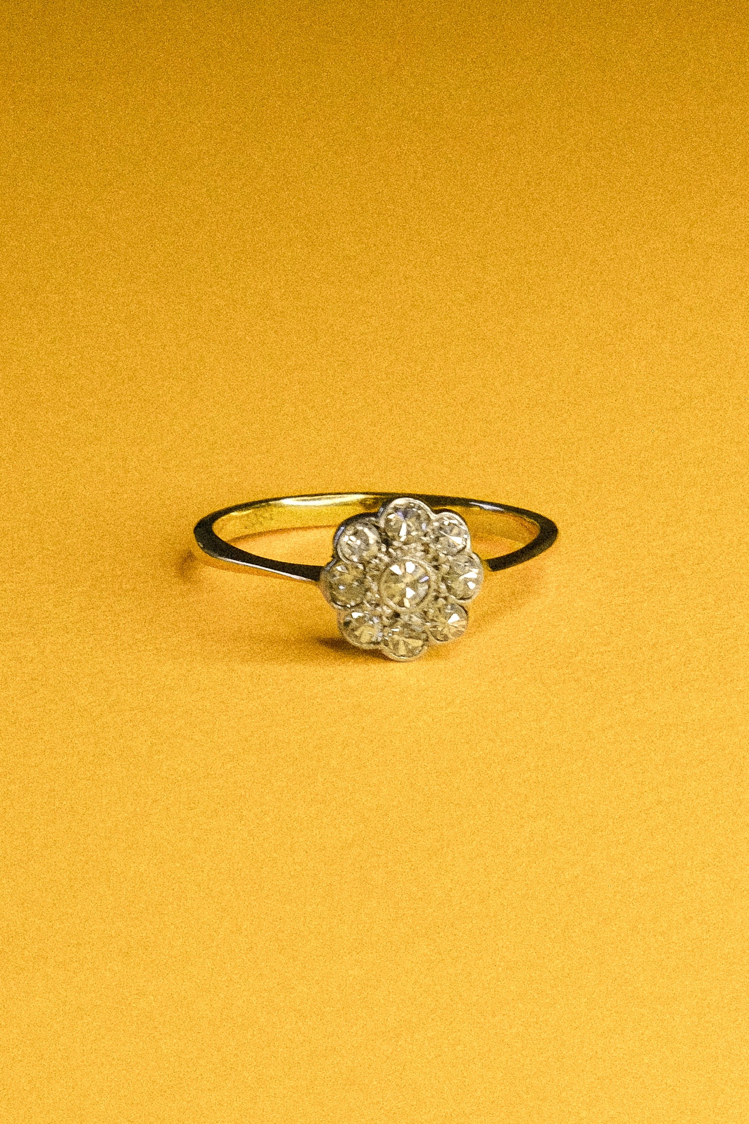 This Antique Edwardian 18ct yellow gold ring features a floral cluster design adorned with beautiful diamonds, exuding elegance and sophistication. The timeless appeal of this exquisite 18ct Gold Diamond daisy cluster ring is further enhanced by its feminine floral arrangement, making it a stunning addition to any finger. The diamonds are delicately set in lustrous White Gold for maximum sparkle and allure. Make a statement with this one-of-a-kind Edwardian Diamond ring, perfect for an unforgettable engagement or a cherished accessory for a lifetime.